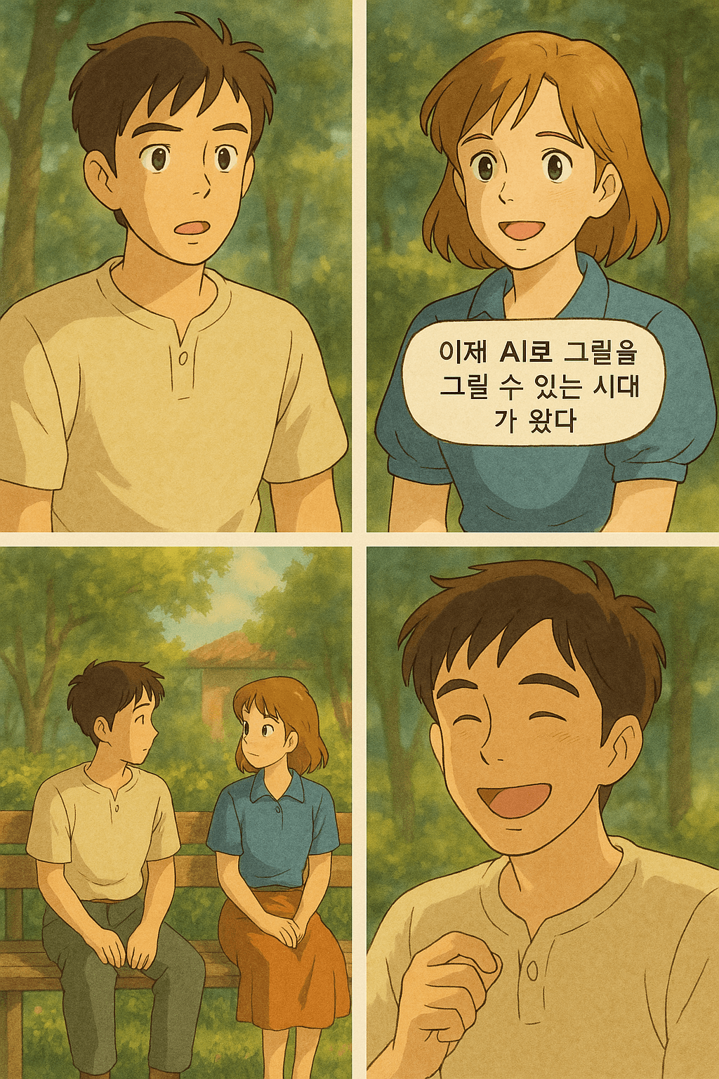 즉, 챗GPT를 이용해 대사와 시나리오를 구성하고, 이미지 생성 AI를 통해 지브리풍의 일러스트로 만화를 완성하는 방식이죠. 기존에는 일러스트 실력이 필요했지만, 이제는 누구나 텍스트만으로 고퀄리티 감성 만화를 만들 수 있습니다.