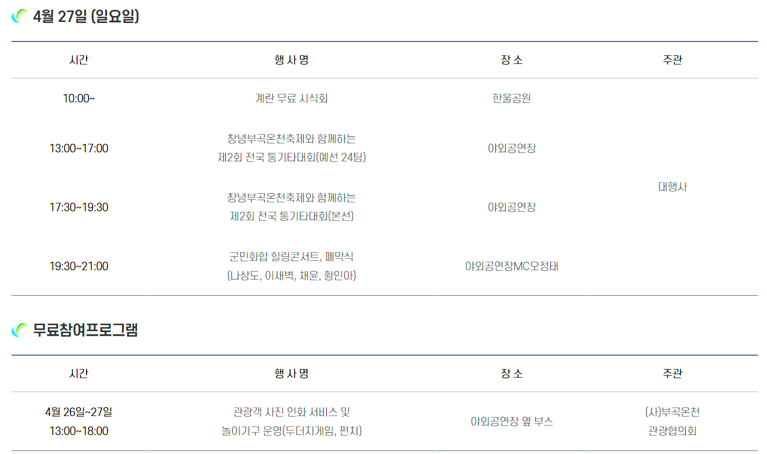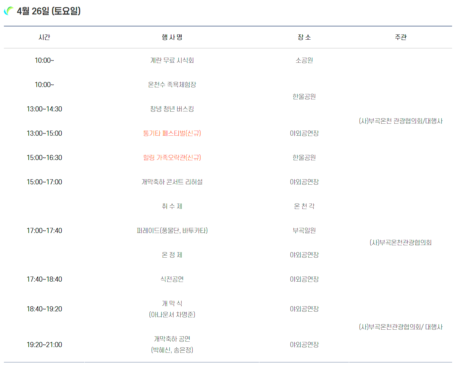 4월 25일 아침 08시부터 행사가 시작됩니다. 금, 토, 일 3일간 족욕체험부터 각종 가족행사 및 라이브 축제, 페스티벌이 준비되어 있다. 무료 참여 프로그램도 준비되어 있으니, 재미있게 즐기기 바랍니다.
