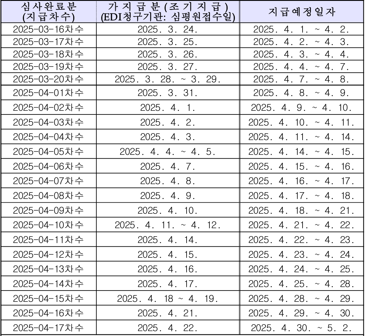 - 조기지급: 심평원에 요양급여비용을 접수한 날짜 기준으로 10일 이내 예정일 산정